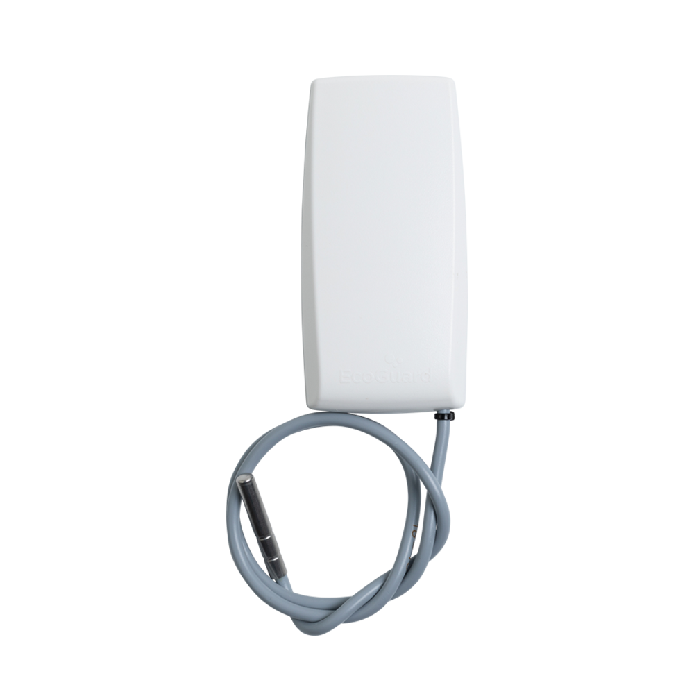 Givaren för mätning av temperatur i rör- och ventilation, uppkopplad med EcoGuard Wireless. För att kunna optimera varje enskild installation, finns givaren med två olika längder på kabeln. Dessa längder är 0,4m och 2m. Givaren sänder mätvärden via trådlös kommunikation. Insamling sker kontinuerligt via EcoGuards Air Receiver (Centralenhet) och mätdatan skickas till Curves för visualisering. Skall givaren monteras i källare, rådgör med EcoGuard för bästa räckvidd. Installation kan utföras av EcoGuards personal eller samarbetspartner. Vill du göra det själv eller med andra underleverantörer är vi delaktiga i projektet medan det fysiska montaget utförs av din personal.